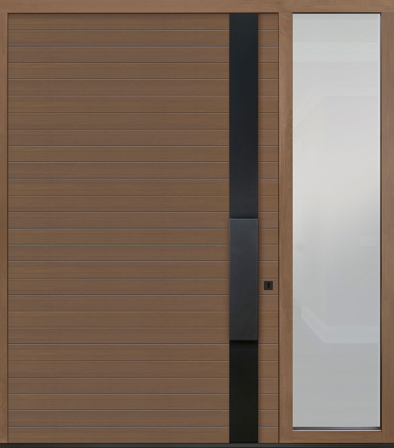 This model shares similarities with PVT-A4, but its more intricate horizontal groove pattern sets it apart. Paired with a metal pull bar, this door strikes a balance between transitional and modern design. The unique groove pattern is eye-catching and unlike any other. Its versatile design makes it a great fit for a variety of projects. The optional sidelight configurations allow for ample natural light while still maintaining privacy. Available with the option to accommodate (1) or (2) sidelights with the material, glass and design of your choice. The use of sidelights is a great option if your door opening is exceptionally wide.